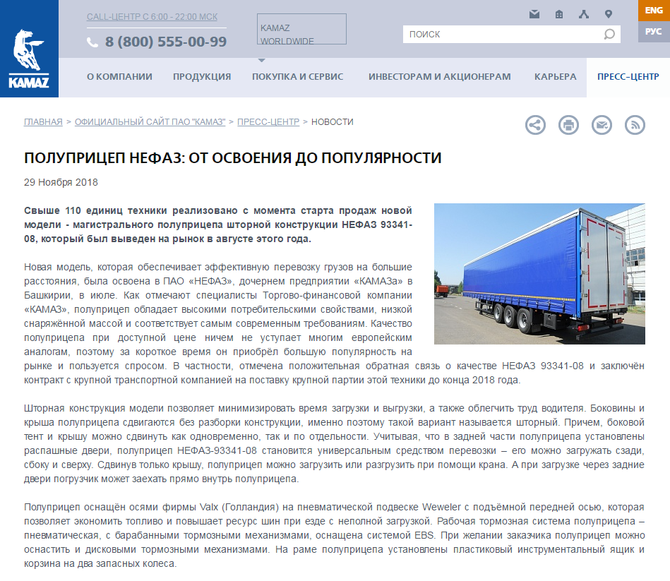 這款新半掛車是今年7月在PJSC NEFAZ生產(chǎn),PJSC NEFAZ是KAMAZ的子公司。這款半掛車能為貨物提供有效的長(zhǎng)距離運(yùn)輸。按照KAMAZ公司的介紹,這